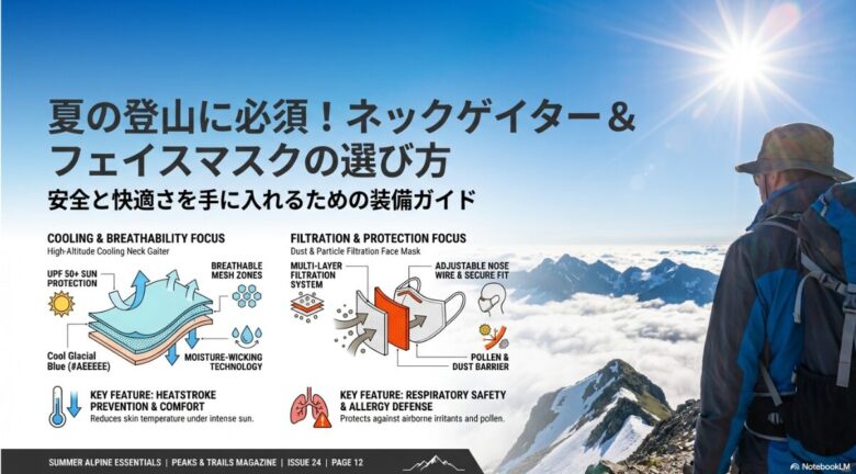 また、首元のケアも忘れずに。ベースレイヤーを襟付きのハーフジップタイプにしたり、ネックゲイザーを活用することで、うっかり日焼けしやすい首の後ろをガードできます。