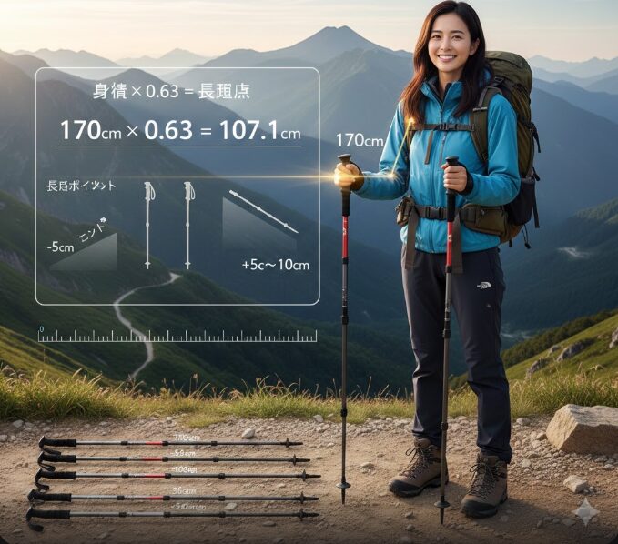 トレッキングポールの長さを決める際、最も一般的で信頼されているのが身長に特定の係数を掛ける方法です。筆者が多くのメーカーやガイドの資料を比較したところ、標準的な登山やトレッキングであれば、「身長 × 0.63」という数値が最もバランスの良い第一近似値になります。