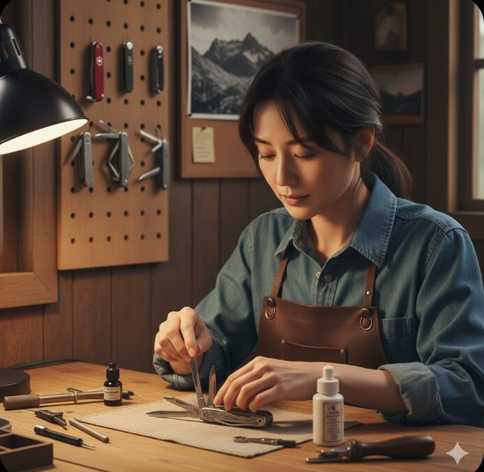 日常のケアとしては、可動部のクリーニングが最優先です。山で果物を切って果汁が付着したり、砂埃がヒンジに入り込んだりすると、ツールの開閉が驚くほど重くなります。