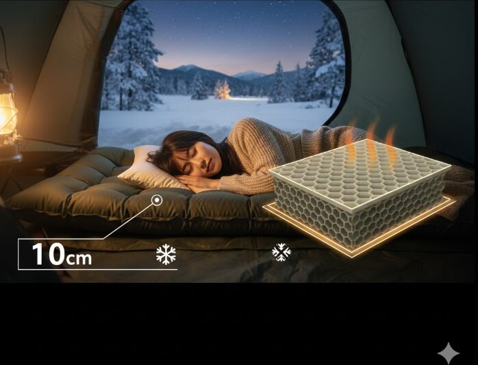 さらに、冬場の底冷え対策としても非常に優秀です。地面からの冷気は体温を奪う最大の要因ですが、10cmのウレタン層が強力な断熱材として機能します。