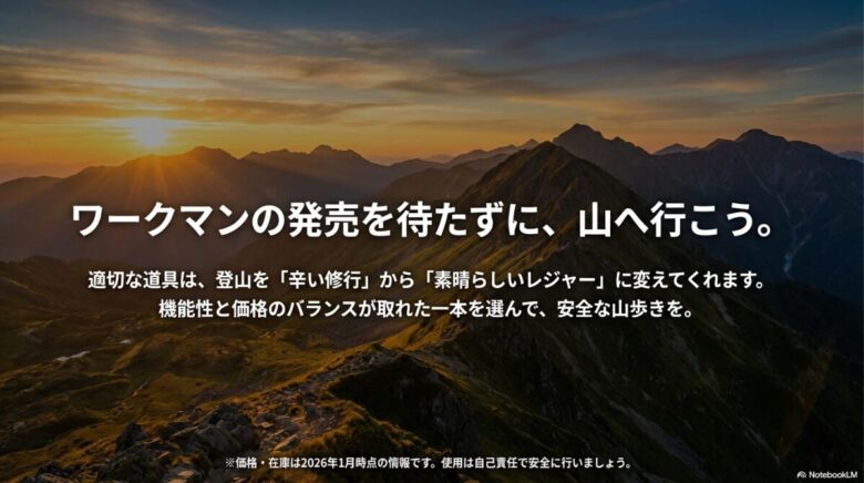登山は、装備が不足していると時に「辛い修行」になってしまいますが、適切な道具があれば「素晴らしいレジャー」になります。ワークマンの精神である「機能性と価格の最適解」を、ポール選びにおいてもぜひ貫いてみてください。