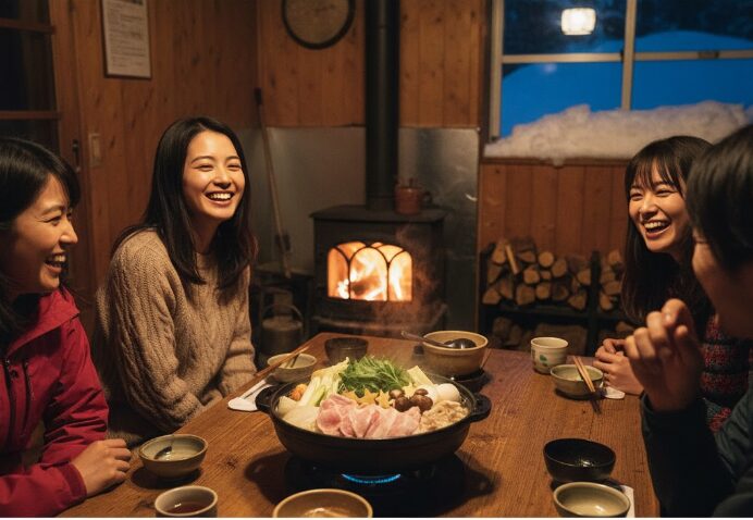 食事の開始時間は、冬期であれば17時半から18時頃。一つの鍋を宿泊者同士で囲むスタイル(現在は個別の配慮がなされる場合もあります)は、自然と会話を弾ませます。